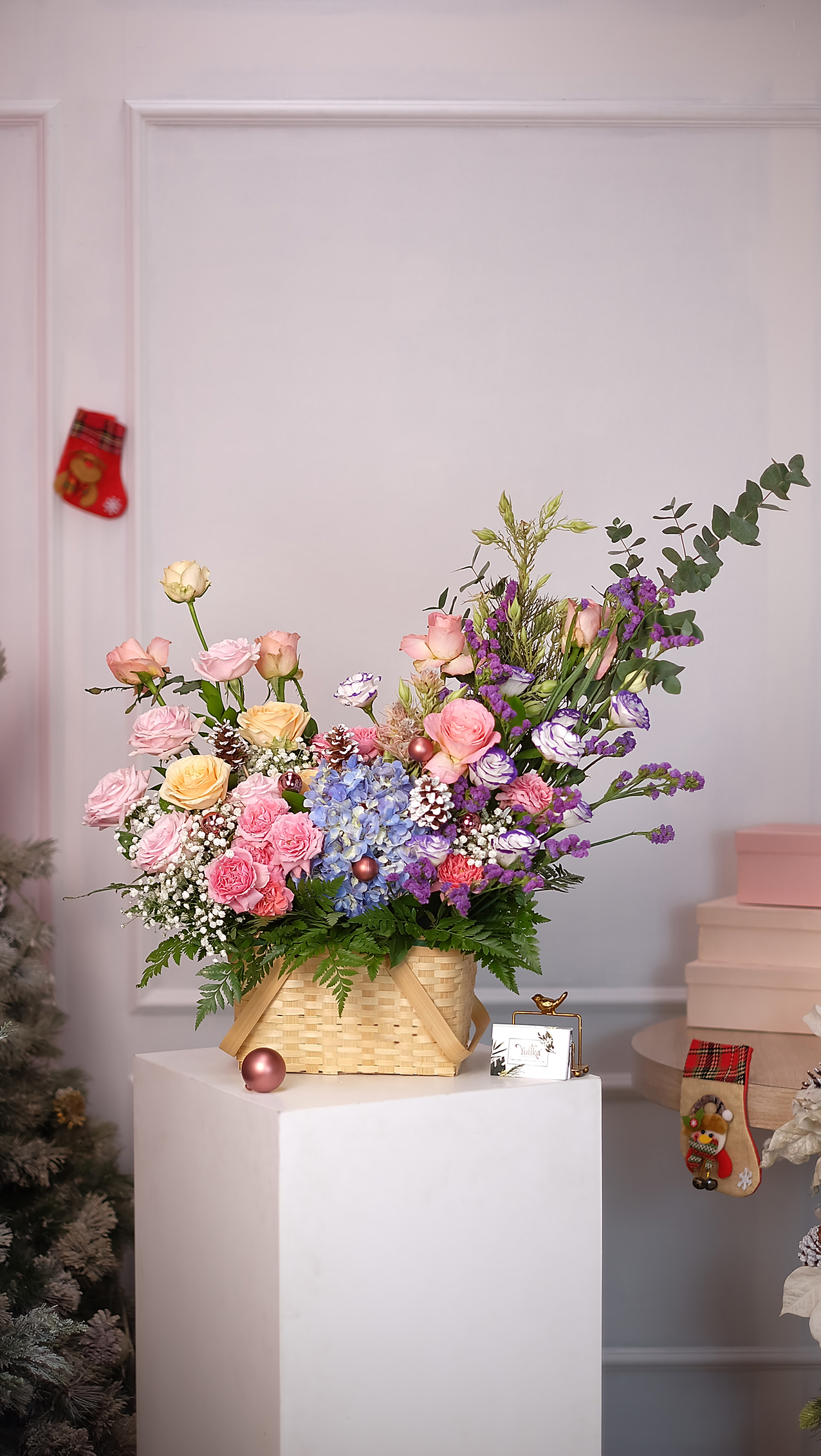 Bring the warmth of the Christmas hearth home! Our Flower basket arrangement blends sweet pink roses, peach roses, baby rose and vibrant purple lisianthus,  finished with purple statice. The perfect centerpiece for a cozy Christmas.